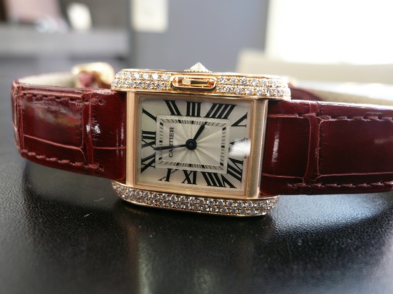 Bracelet : Croco rouge lie-de-vin avec boucle déployante Cartier Boîtier : Or rose serti de 81 brillants Mouvement : Quartz Cadran : Argent Taille : 30,2 x 22,7 mm Année : 2016