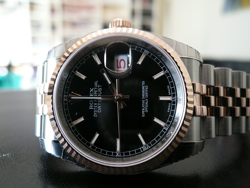 Bracelet : Or rose et acier avec boucle déployante Rolex Boîtier : Or rose et acier Mouvement : Automatique Cadran : Noir Diamètre : 36 mm Année : 2015